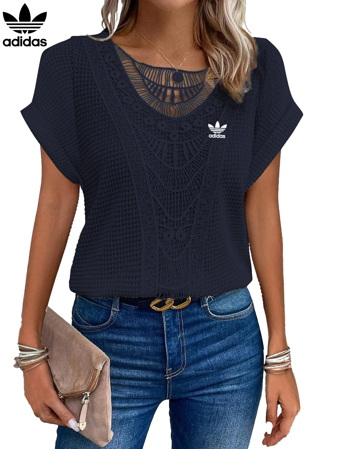 Add a graceful finish to your everyday wardrobe with the Adidas – New Trendy T-Shirt. Featuring intricate lace accents across the neckline and front, this piece brings a soft romantic charm to a flattering, easy-to-wear silhouette. Whether paired with denim or dressed up with a skirt, it’s your go-to for elevated casualwear.